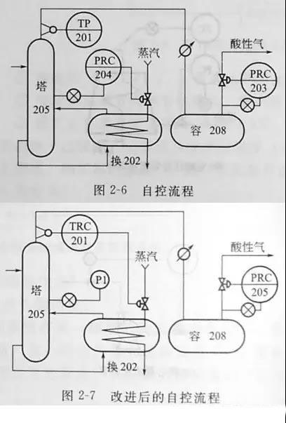 改進(jìn)措施:容208的壓力實(shí)際上代表著塔205的壓力,故塔205的壓力不需要再控制而改用塔頂溫度調(diào)節(jié)進(jìn)換202的蒸汽量,使兩個(gè)調(diào)節(jié)回路的響應(yīng)速度變成一快一慢,減少互相干擾。改進(jìn)后的自控流程如圖2-7所示。