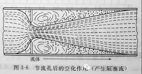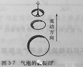 一是產(chǎn)生阻塞流,如圖3-6所示,許多氣泡集中在閥的節(jié)流孔后,阻礙流體的流動,自然影響了流量的增加,即產(chǎn)生了阻塞情況。二是產(chǎn)生汽蝕,如圖3-7所示,產(chǎn)生空化作用時,在縮流處的后面由于壓力恢復,升高的壓力壓縮氣泡,達到臨界尺寸的氣泡開始變?yōu)闄E圓形,接著在上游表面開始變平,然后突然爆裂。所有的能量集中在破裂點上,產(chǎn)生極大的沖擊力。如果氣泡在接近節(jié)流孔后的固體表面處破裂,這種沖擊力會慢慢地撕裂材料表面,形成類似于煤渣的粗糙表面。