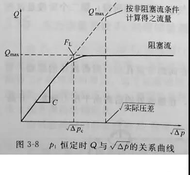 由圖3-8可見,產(chǎn)生阻塞流時(shí),若按實(shí)際壓差計(jì)算,對應(yīng)按非阻塞流條件計(jì)算得到的流量Q'max要比阻塞流量Qmax大許多。因此,為了求得此時(shí)的Kv值,只能把開始產(chǎn)生阻塞流時(shí)的閥壓隆
