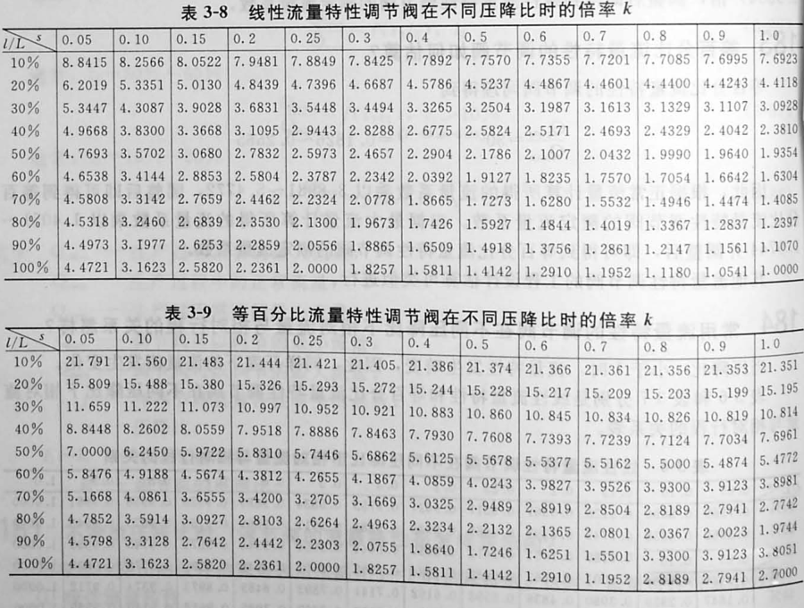 表3-6和表3-7分別是線性流量特性和等百分比流量特性調(diào)節(jié)閥在不同壓降比下相對流量與相對行程的關(guān)系表。