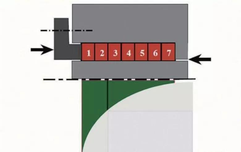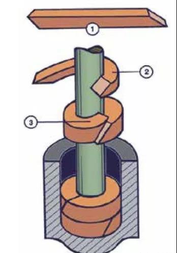 絕不能用繞線圈的方式將盤根材料裝滿填料函,而是用專用切割工具切割盤根編織材料,并制成獨(dú)立的盤根環(huán),切口呈45º(斜接)(見圖6),這樣可以利用載荷獲得更好的端面結(jié)合。