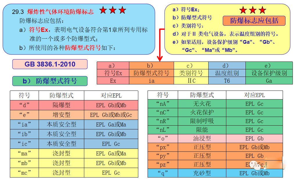 GB 3836.1-2010 爆炸性環(huán)境 第1部分:設(shè)備 通用要求29.14 標(biāo)志示例 易產(chǎn)生瓦斯的煤礦用隔爆外殼“d”(EPL Mb):Ex d Ⅰ Mb 或 Ex db Ⅰ。 帶本質(zhì)型“i”(EPL Ga)輸出電路的隔爆外殼Ex元件“d”(EPL Gb),用于除易產(chǎn)生煤礦瓦斯氣體外的C級爆炸性氣體環(huán)境(防爆合格證編好后加符號“U”):Ex d[ia Ga] ⅡC Gb 或 Ex db [ia] ⅡC。 使用增安型“e”(EPL Gb)和正壓外殼“px”型(EPL Gb)的電氣設(shè)備,高表面溫度125℃,用于除易產(chǎn)生瓦斯的煤礦外的、引燃溫度高于125℃的爆炸性氣體環(huán)境,在防爆合格證中注明使用的具體條件(防爆合格證編好后加符號“X”):Ex e px ⅡC 125℃(T4)Gb 或 Ex eb pxb ⅡC 125℃(T4) 使用隔板外殼“d”(EPL Mb和Gb)和增安型“e”(EPL Mb和Gb)的煤礦用電氣設(shè)備和用于除易產(chǎn)生瓦斯的煤礦外的B級氣體、引燃溫度高于200℃的爆炸性氣體環(huán)境:Ex de Ⅰ Mb 或 Ex db eb ⅠEx de ⅡB T3 Gb 或 Ex db eb ⅡB T3 用于除易產(chǎn)生瓦斯的煤礦外的、僅存在氨氣爆炸性氣體環(huán)境用的隔爆外殼電氣設(shè)備“d”(EPL Gb):Ex d Ⅱ氨(NH3)Gb 或 Ex db Ⅱ氨(NH3) 用于具有導(dǎo)電性粉塵的爆炸性粉塵環(huán)境ⅢC等級澆封型電氣設(shè)備“ma”(EPL Da),高表面溫度低于120℃:Ex ma ⅢC T120℃ Da 或 Ex ma ⅢC T120℃   IP68 用于具有導(dǎo)電性粉塵的爆炸性粉塵環(huán)境ⅢC等級“ia”(EPL Da)型電氣設(shè)備,高表面溫度低于120℃:Ex ia ⅢC T120℃ Da 或 Ex ia ⅢC T120℃   IP20 用于具有導(dǎo)電性粉塵的爆炸性粉塵環(huán)境ⅢC等級“p”(EPL Db)型電氣設(shè)備,高表面溫度低于120℃:Ex p ⅢC T120℃ Db 或 Ex pb ⅢC T120℃  IP65 用于具有導(dǎo)電性粉塵的爆炸性粉塵環(huán)境ⅢC等級“t”(EPL Db)型電氣設(shè)備,高表面溫度低于225℃,當(dāng)用500mm的粉塵層試驗時低于320℃:Ex t ⅢC T225℃ T500 320℃ Db 或 Ex tb ⅢC T225℃ T500 320℃  IP65