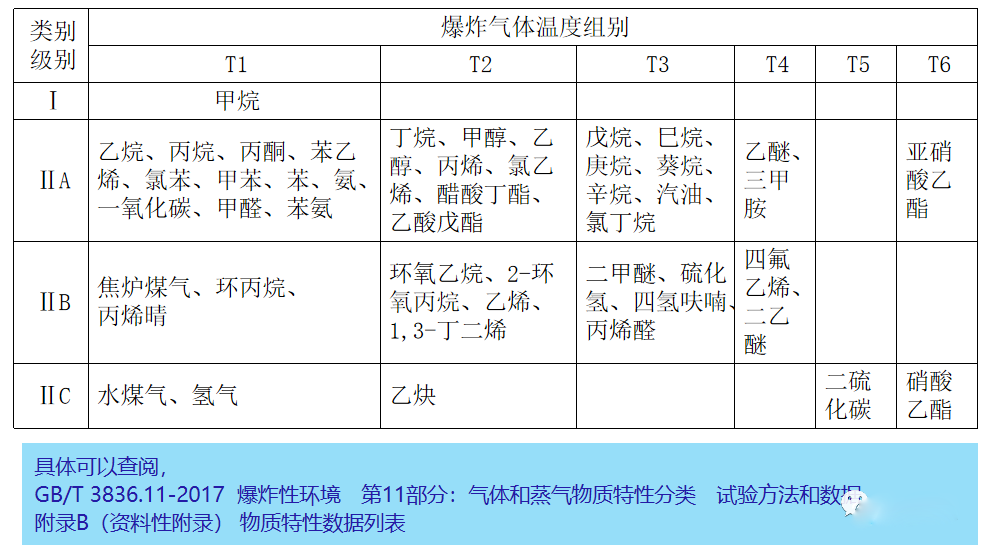 防爆電氣設(shè)備的級別和組別不應(yīng)低于該爆炸性氣體環(huán)境內(nèi)爆炸性氣體混合物的級別和組別。