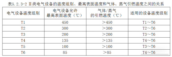 Ⅱ類電氣設(shè)備的溫度組別、高表面溫度和氣體、蒸氣引燃溫度之間的關(guān)系符合表5.2.3-2的規(guī)定。