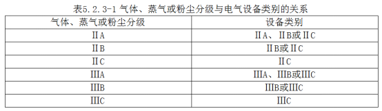 防爆電氣設(shè)備的級別和組別不應(yīng)低于該爆炸性氣體環(huán)境內(nèi)爆炸性氣體混合物的級別和組別。氣體、蒸氣或粉塵分級與電氣設(shè)備類別的關(guān)系應(yīng)符合表5.2.3-1的規(guī)定: