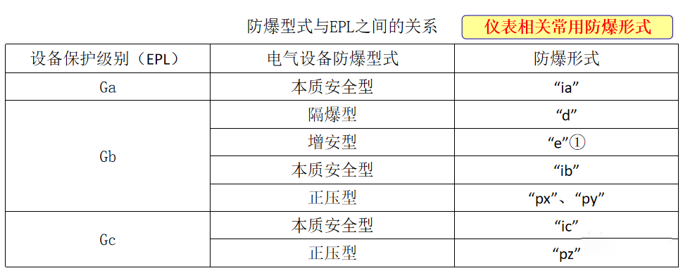 常用防爆儀表的電氣設(shè)備保護級別(EPL)與電氣設(shè)備防爆型式的關(guān)系應(yīng)符合下表:
