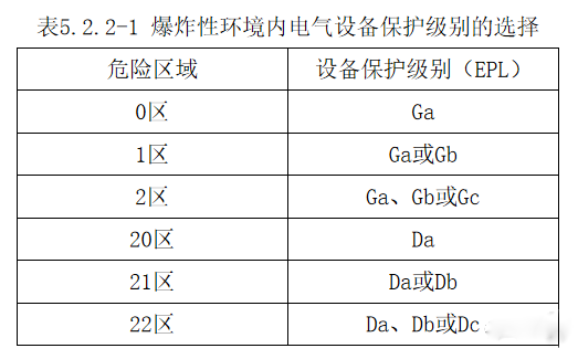 1 爆炸性環(huán)境內(nèi)電氣設(shè)備保護級別的選擇應(yīng)符合表5.2.2-1的規(guī)定。
