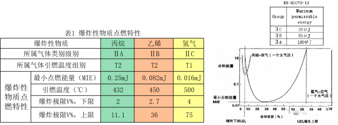 爆炸性氣體物質(zhì)不同點燃特性的舉例見表1。