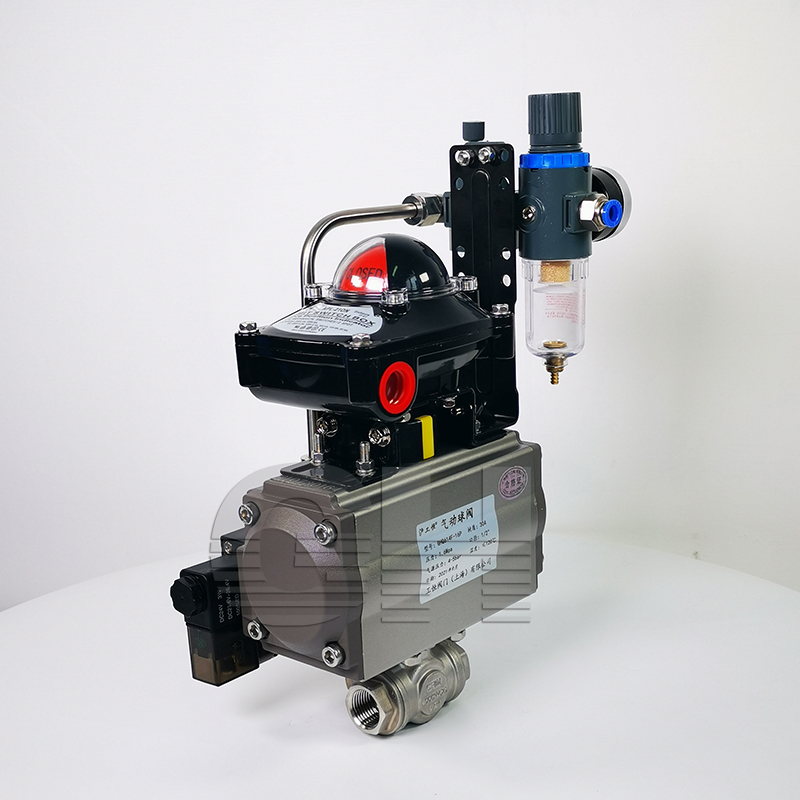 氣動內螺紋(對焊 式)球閥是由雙(單)作用氣動 活塞式執(zhí)行器和內螺紋(對焊式)球閥組 成。其閥體可 分為整體式、二段式、 三段式。閥座采用彈性密封結構,密封可靠,啟閉輕松。閥桿采用有倒密封的下裝式結構,閥腔異常升壓時,閥桿不會被沖擊。氣動活塞式執(zhí)行器采用低摩擦材料做 成軸承套,缸體內外表面經(jīng)硬質陽極氧化防腐處理,大大提高了氣缸的使用。本產(chǎn)品使用性能穩(wěn)定,廣泛的用于石化、冶金、電力、輕工、醫(yī)藥等工業(yè)部門。工作原理當氣動執(zhí)行器與 電路和系統(tǒng)氣源接通后,空氣通過管道A或B管進入A缸(B缸)推動活塞向一端運動,從而帶動旋轉軸和球芯轉動90°□氣動執(zhí)行器頂部連動可視器,當綠色標志指向“開”字時標志閥門開啟!趸匦牌餍盘枱艟G燈亮時閥門處在開啟位置,而紅燈亮時閥門處在關閉位置□定位器可調節(jié)