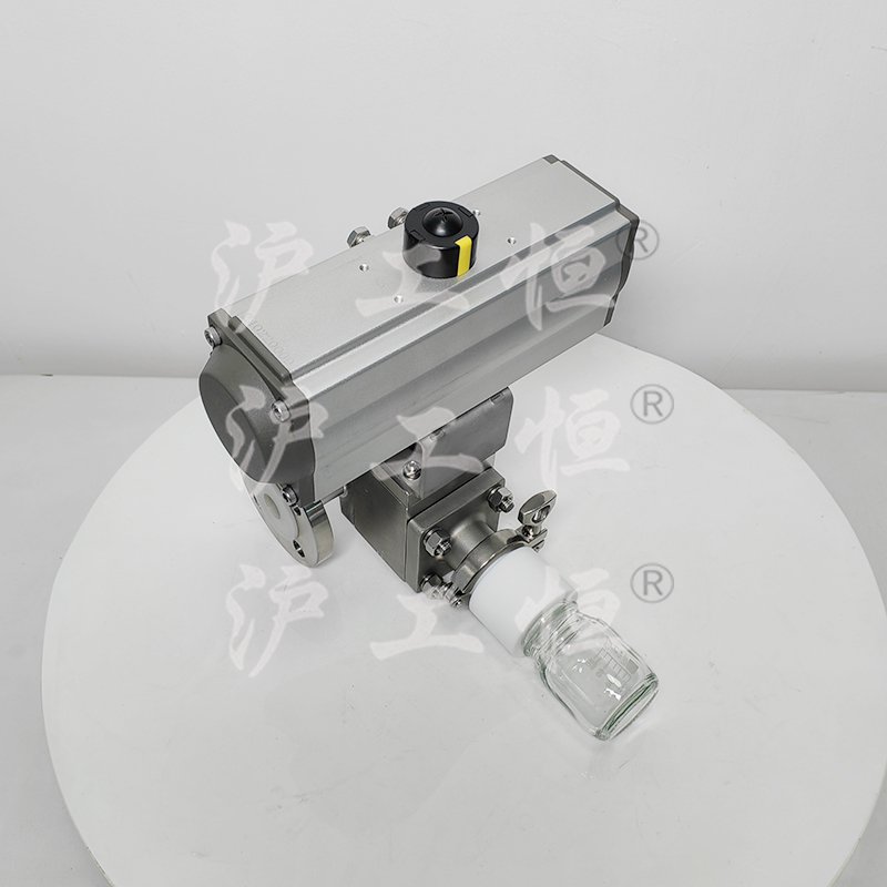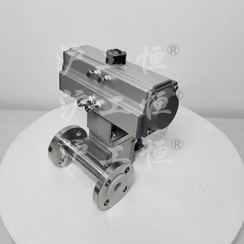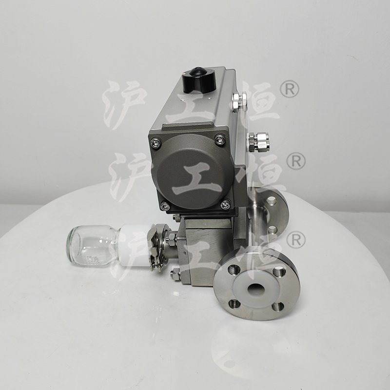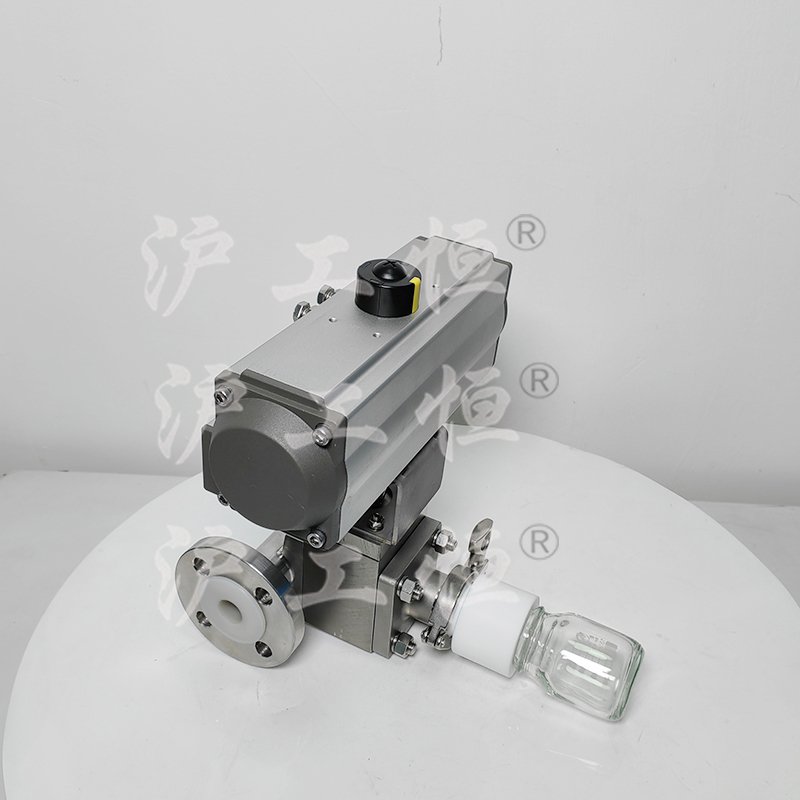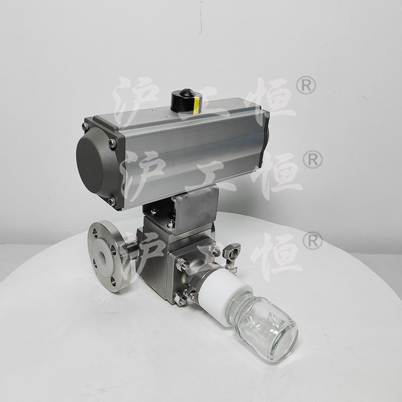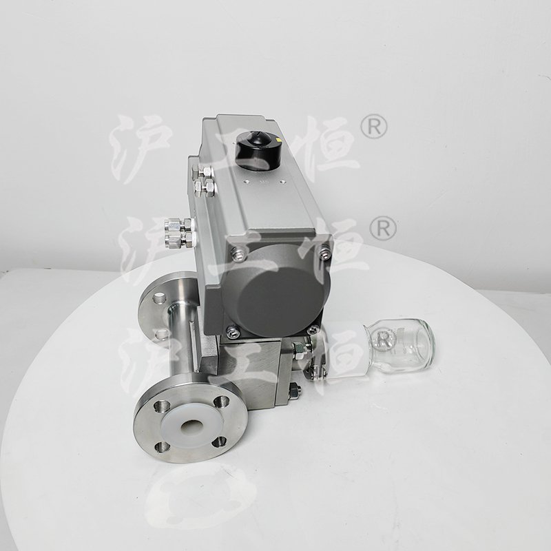 GHQZXQYF46-16RL氣動襯氟定量取樣閥采用全襯氟設(shè)計,可以在腐蝕性工況的取樣,解決特材造價高的問題,GHQZXQYF46-16RL氣動襯氟定量取樣閥主要有襯氟閥體、襯氟閥芯、襯氟閥桿、閥座、氣動執(zhí)行機構(gòu)、取樣瓶組成,取樣瓶為可拆卸設(shè)計,試樣進(jìn)入取樣瓶內(nèi),可將取樣瓶密封,避免污染試樣,流道無流阻設(shè)計,不影響流量,閥桿通過手柄、電動執(zhí)行機構(gòu)、氣動執(zhí)行機構(gòu)旋轉(zhuǎn)帶動閥桿及閥芯使試樣進(jìn)入閥芯內(nèi),通過旋轉(zhuǎn)閥芯180°實現(xiàn)試樣進(jìn)入取樣瓶內(nèi),放樣的同時,閥芯將取樣口關(guān)閉,從而做到零泄漏及無壓取樣,不會因開關(guān)閥門對取樣瓶造成壓力沖擊,從而保證操作者的安全。取樣瓶可選透明和避光兩種,本取樣閥廣泛應(yīng)用在制藥、化工、食品行業(yè)。