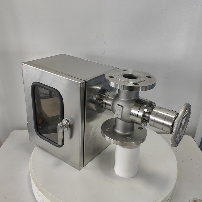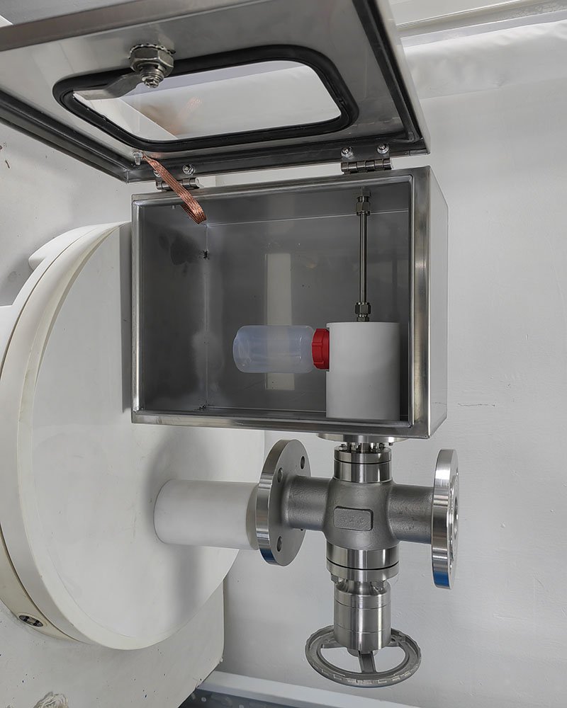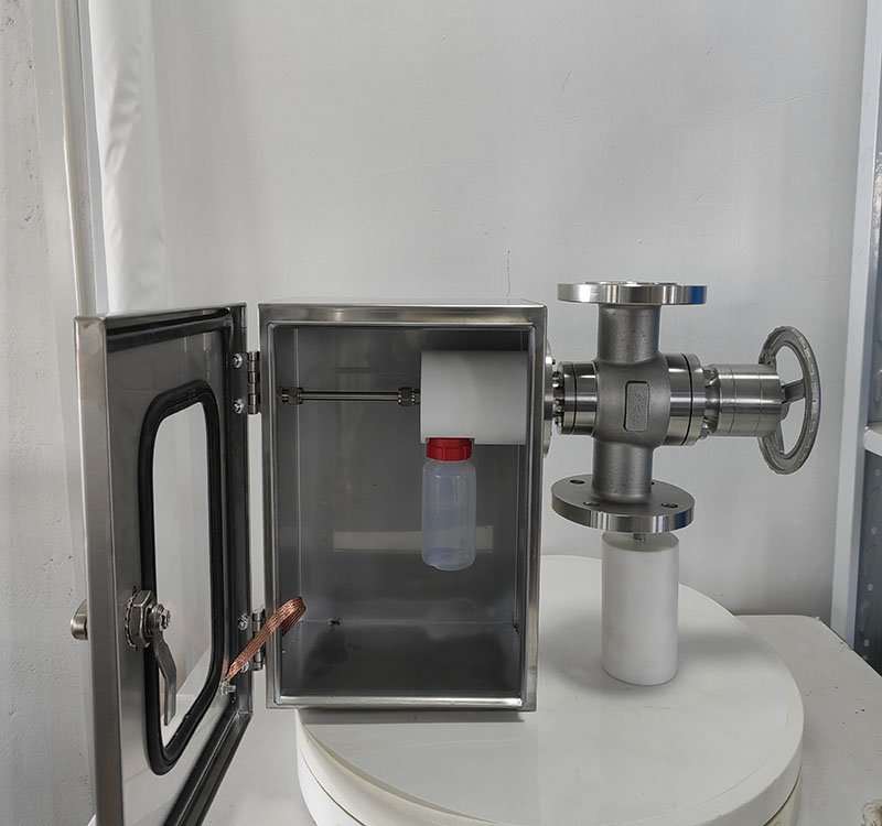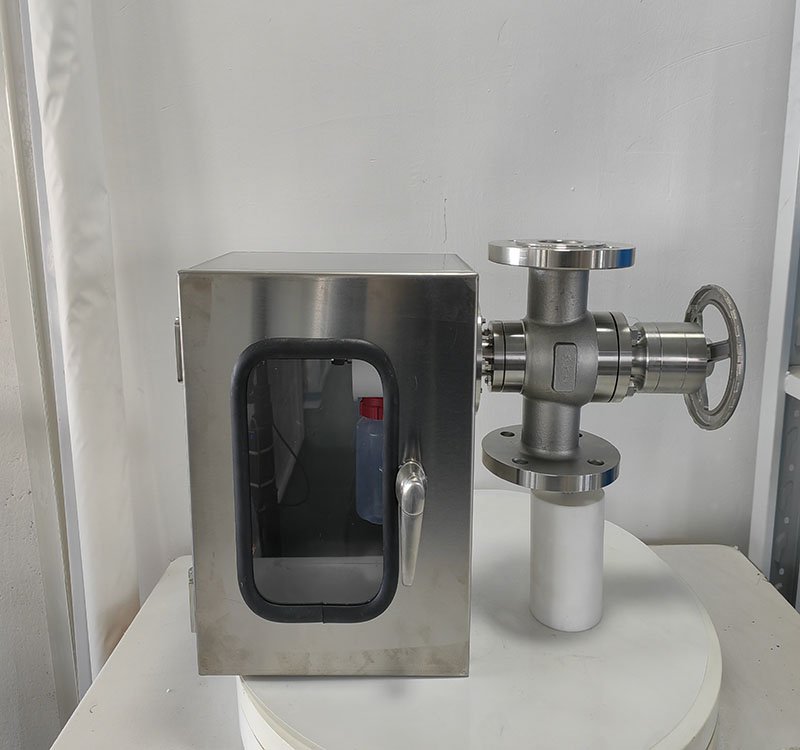 GHZSQYFSZMB-16RL豎直裝帶取樣箱取樣閥采用全襯氟設(shè)計(jì),可以在腐蝕性工況的取樣,解決特材造價(jià)高的問題,GHZSQYFSZMB-16RL豎直裝帶取樣箱取樣閥主要有襯氟閥體、襯氟閥芯、襯氟閥桿、閥座、氣動(dòng)執(zhí)行機(jī)構(gòu)、取樣瓶組成,取樣瓶為可拆卸設(shè)計(jì),試樣進(jìn)入取樣瓶內(nèi),可將取樣瓶密封,避免污染試樣,流道無流阻設(shè)計(jì),不影響流量,閥桿通過手柄、電動(dòng)執(zhí)行機(jī)構(gòu)、氣動(dòng)執(zhí)行機(jī)構(gòu)旋轉(zhuǎn)帶動(dòng)閥桿及閥芯使試樣進(jìn)入閥芯內(nèi),通過旋轉(zhuǎn)閥芯180°實(shí)現(xiàn)試樣進(jìn)入取樣瓶內(nèi),放樣的同時(shí),閥芯將取樣口關(guān)閉,從而做到零泄漏及無壓取樣,不會(huì)因開關(guān)閥門對取樣瓶造成壓力沖擊,從而保證操作者的安全。取樣瓶可選透明和避光兩種,本取樣閥廣泛應(yīng)用在制藥、化工、食品行業(yè)。