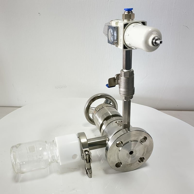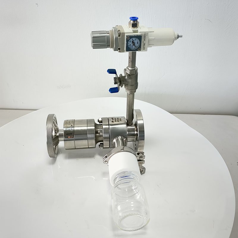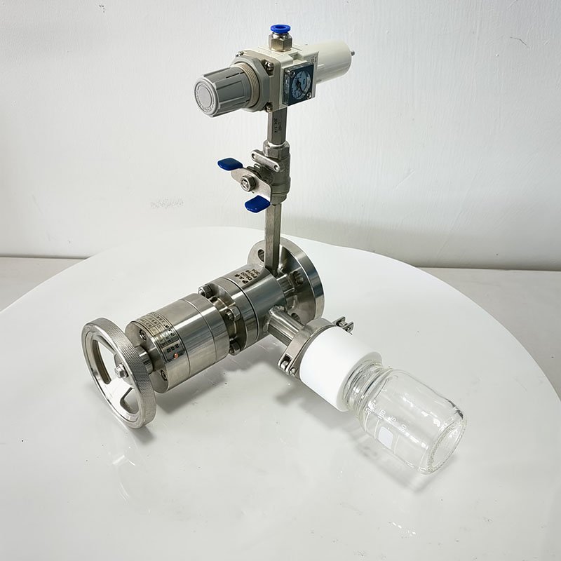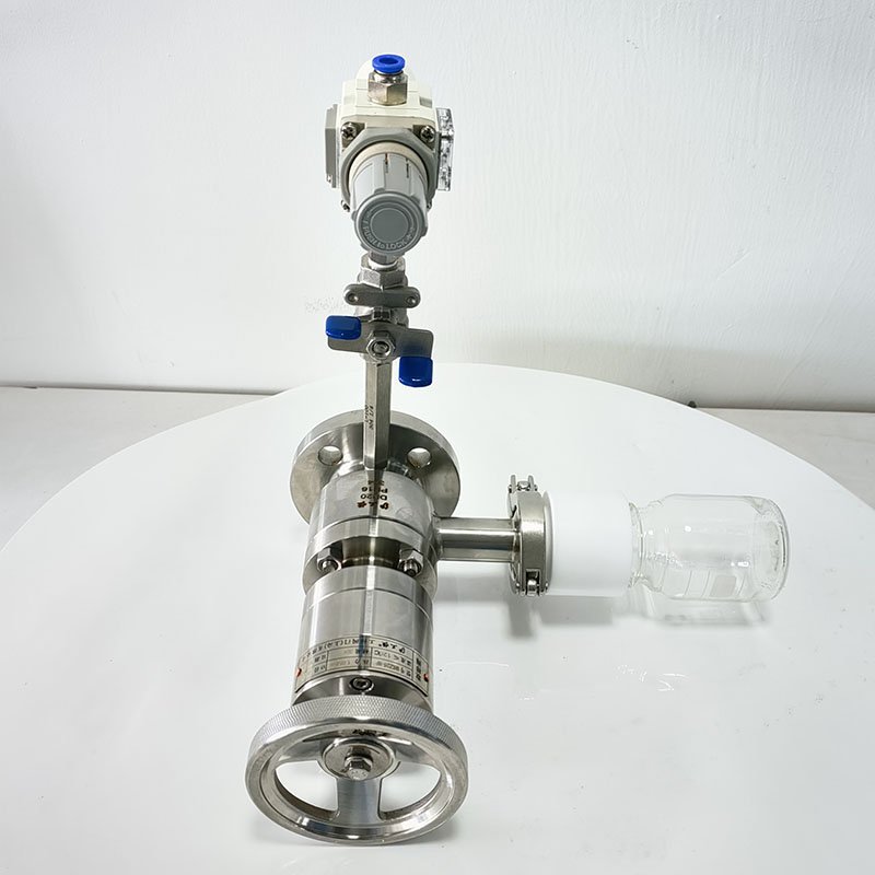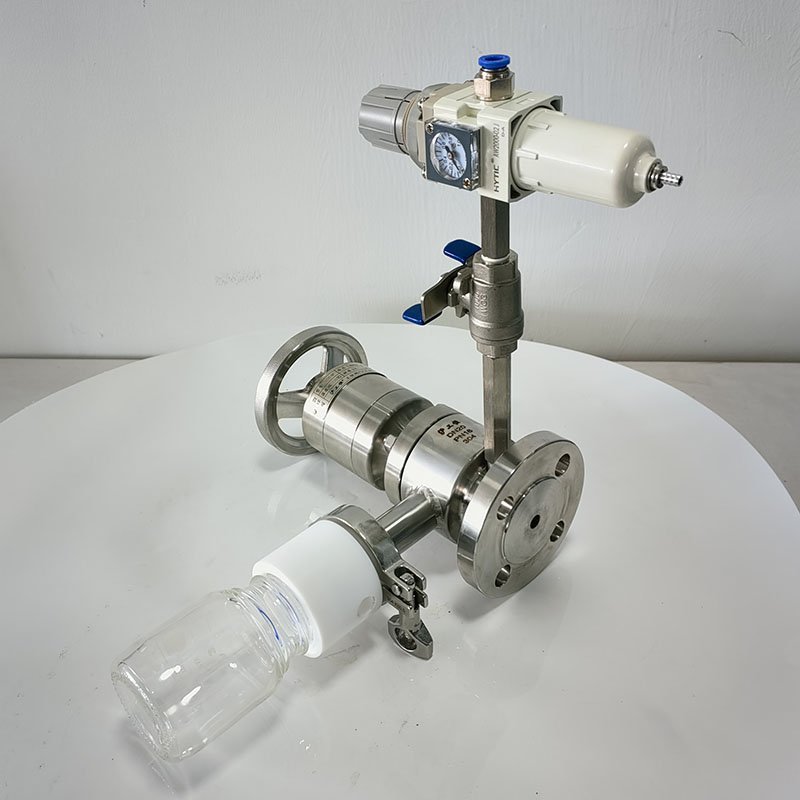 罐底側(cè)裝取樣閥-帶吹掃采用全襯氟設(shè)計(jì),可以在腐蝕性工況的取樣,解決特材造價(jià)高的問題,罐底側(cè)裝取樣閥-帶吹掃主要有襯氟閥體、襯氟閥芯、襯氟閥桿、閥座、氣動(dòng)執(zhí)行機(jī)構(gòu)、取樣瓶組成,取樣瓶為可拆卸設(shè)計(jì),試樣進(jìn)入取樣瓶?jī)?nèi),可將取樣瓶密封,避免污染試樣,流道無流阻設(shè)計(jì),不影響流量,閥桿通過手柄、電動(dòng)執(zhí)行機(jī)構(gòu)、氣動(dòng)執(zhí)行機(jī)構(gòu)旋轉(zhuǎn)帶動(dòng)閥桿及閥芯使試樣進(jìn)入閥芯內(nèi),通過旋轉(zhuǎn)閥芯180°實(shí)現(xiàn)試樣進(jìn)入取樣瓶?jī)?nèi),放樣的同時(shí),閥芯將取樣口關(guān)閉,從而做到零泄漏及無壓取樣,不會(huì)因開關(guān)閥門對(duì)取樣瓶造成壓力沖擊,從而保證操作者的安全。取樣瓶可選透明和避光兩種,本取樣閥廣泛應(yīng)用在制藥、化工、食品行業(yè)。