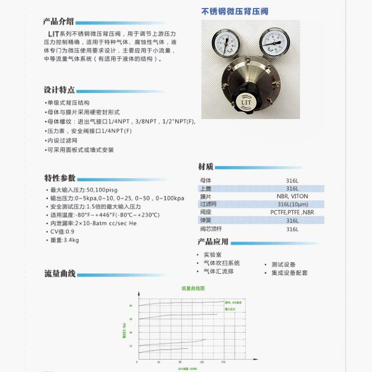 單級式減壓結(jié)構(gòu),母體與膜片采用硬密封形式,內(nèi)設(shè)過濾網(wǎng),可采用面板式或墻式安裝 實驗室 氣體吹掃系統(tǒng) 腐蝕性氣體、特種氣體 氣體匯流排 測試設(shè)備,采用超大面積膜片,適用于微小壓力場合。