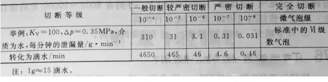 上述標準分還不夠細膩,特別是IV級密封和V級密封,其泄漏率由10-4突然躍到10-7。為此,認為應將泄漏標準與切斷的關系進一步細分。切斷的等級與對應的泄漏率見表1-7.