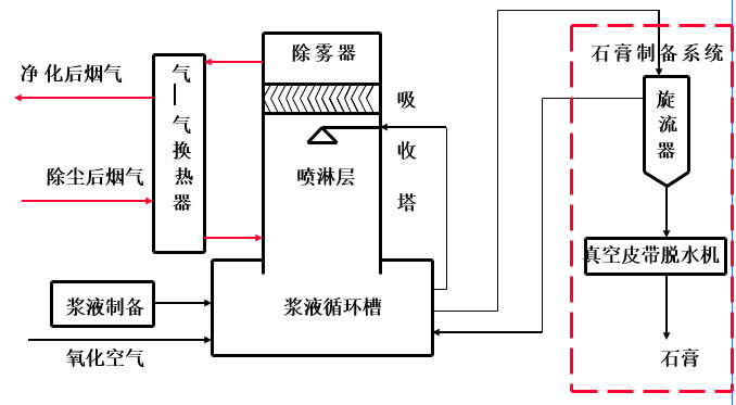 系統(tǒng)包括:氣-氣換熱器、吸收塔、石灰石粉和石灰石漿液制備、漿液循環(huán)槽、石膏脫水系統(tǒng)
