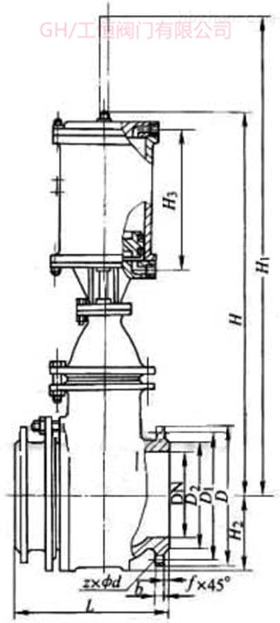 PZ641H-16C 型氣動(dòng)鋼制排渣閘閥主要外形及結(jié)構(gòu)尺寸(mm)| DN | L | D | D1 | D2 | z×Φ | b | f | H3 | H2 | H | H1 | 重量/kg |